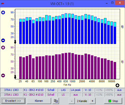Somit stellen die Spektren einer Oktavanalyse gewissermaßen eine Gattung zwischen Kennwerten und der Frequenzanalyse dar. Es sind auf einen Blick Kennwerte in verschiedenen Frequenzbereichen erkennbar.